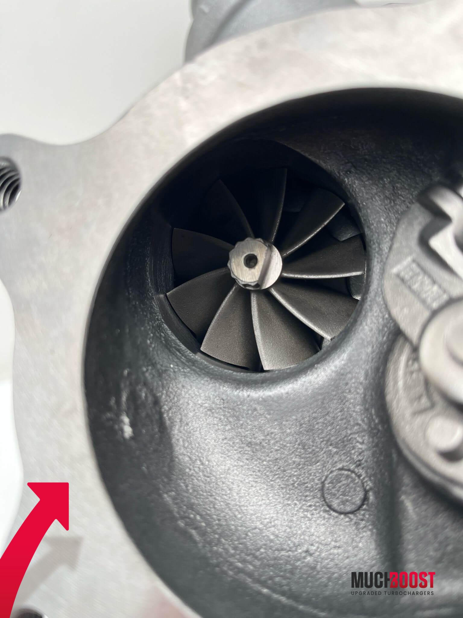 - Additionally Enlarged and lightened High-Flow 9 Blade Turbine Wheel to provide much more flow and lower exhaust temperatures with higher boost.