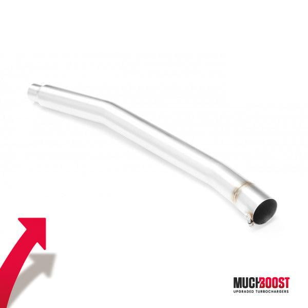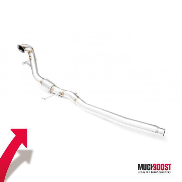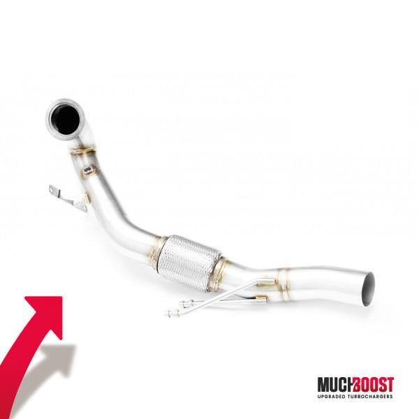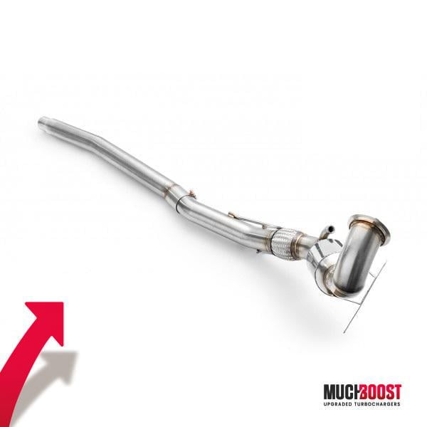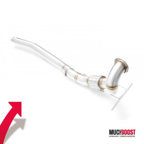 Every part of this racing focused downpipe replacement is produced using CNC technology and is fully made out of Acid-Resistant Steel. If you choose a De-Cat Version, which doesn’t include the Catalytic Converter (CAT), you will significantly reduce the back pressure which leads to faster spool, an increase of power and more aggressive exhaust sound. The Race Cat version also offers huge flow improvement over the stock catalyst, which is the cause of very significant flow resistance. The bigger the diameter of the downpipe, the easier and quicker the turbocharger is able to lead off the exhaust gas. The design of the MuchBoost downpipe is optimized for minimization of variances in cross section area in order to get smooth exhaust gas flow and top performance.