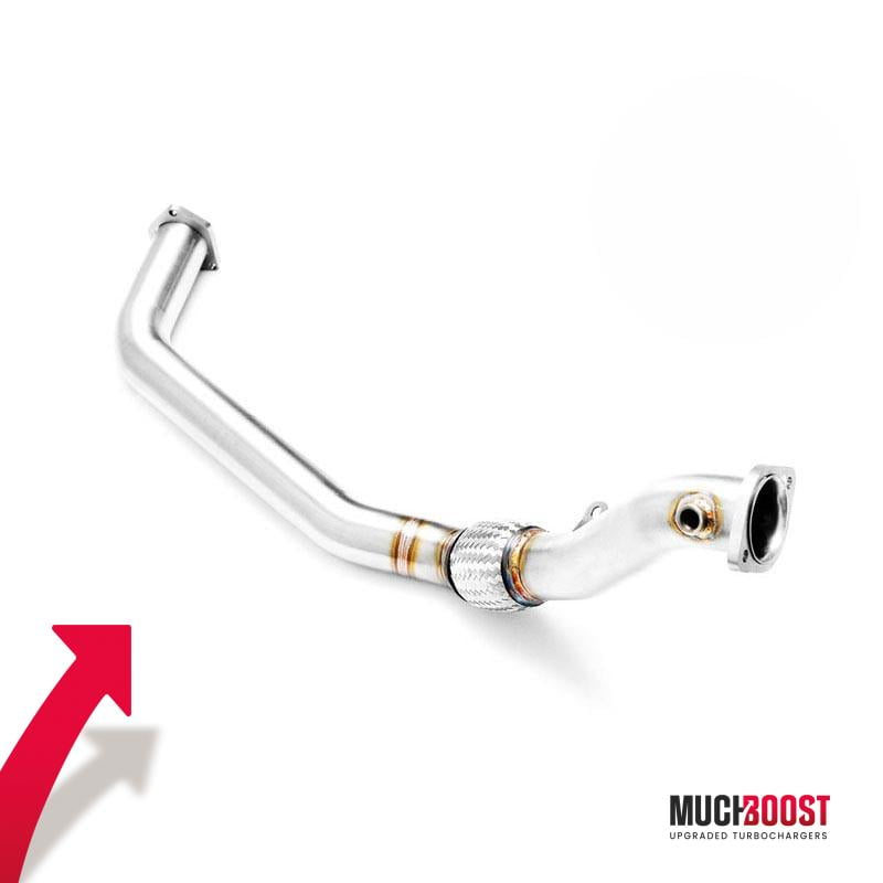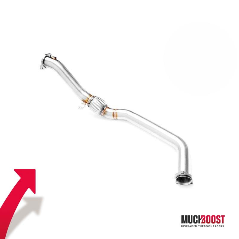 Every part of this racing-focused downpipe replacement is produced using CNC technology and is fully made out of Acid-Resistant Steel. It doesn’t include the Catalytic Converter (CAT) and thereby significantly reduces the back pressure which leads to a faster spool, an increase in power, and a more aggressive exhaust sound. The Sports Cat version also offers huge flow improvement over the stock catalyst, which is the cause of very significant flow resistance. The bigger the diameter of the downpipe, the easier and quicker the turbocharger is able to lead off the exhaust gas. The design of the MuchBoost downpipe is optimized for minimization of variances in cross-section area in order to get smooth exhaust gas flow and top performance.