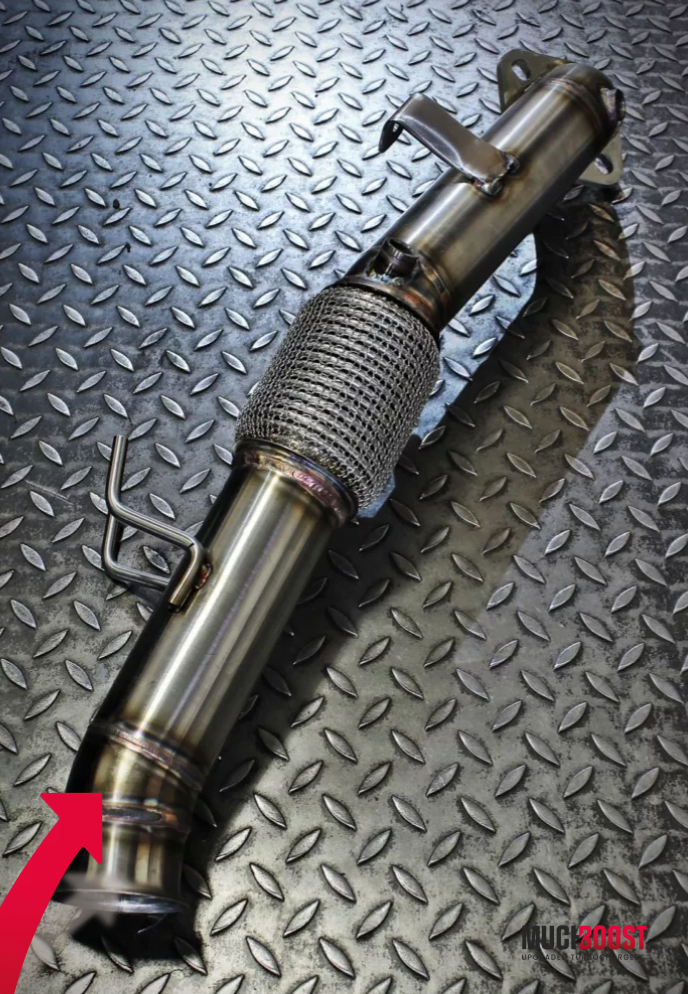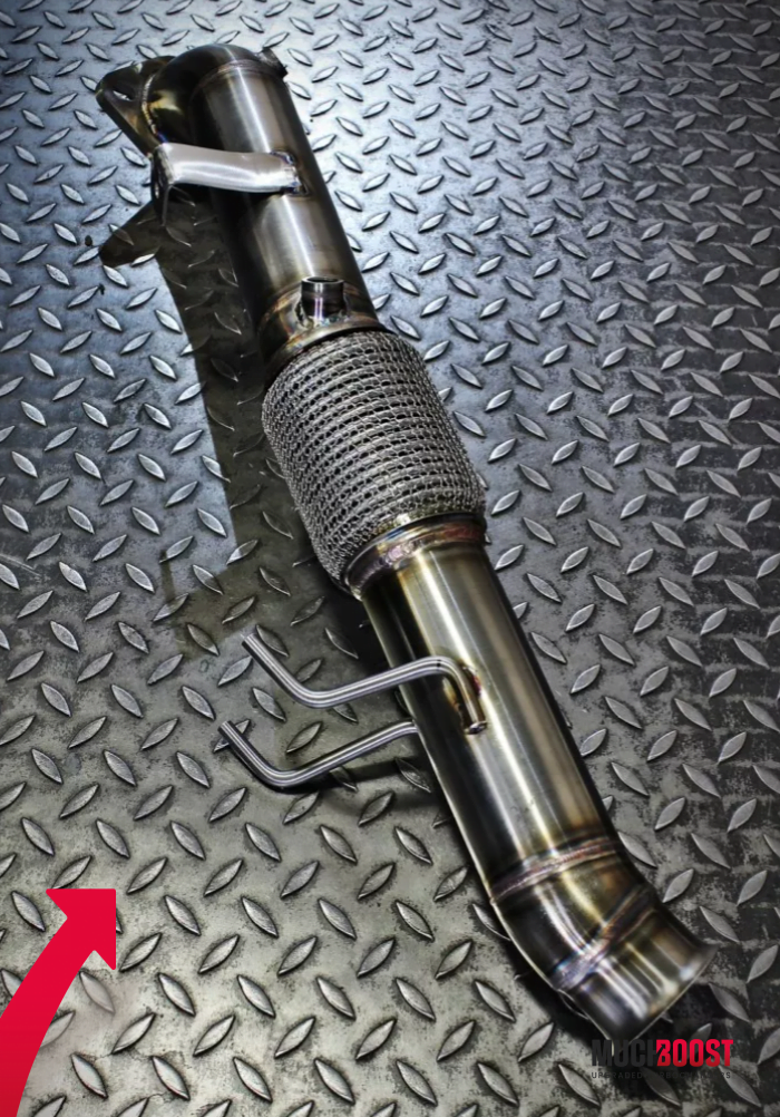 Every part of this racing-focused downpipe replacement is produced using CNC technology and is fully made out of Acid-Resistant Steel. It doesn’t include the Catalytic Converter (CAT) and thereby significantly reduces the back pressure which leads to faster spool, an increase of power, and more aggressive exhaust sound. The Sport Cat version also offers huge flow improvement over the stock catalyst, which is the cause of very significant flow resistance. The bigger the diameter of the downpipe, the easier and quicker the turbocharger is able to lead off the exhaust gas. The design of the MuchBoost downpipe is optimized for minimization of variances in cross-section area in order to get smooth exhaust gas flow and top performance.