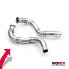 Every part of this racing focused downpipe replacement is produced using CNC technology and is fully made out of Acid-Resistant Steel. It doesn’t include the Catalytic Converter (CAT) and thereby significantly reduces the back pressure which leads to faster spool, an increase of power and more aggressive exhaust sound. The bigger the diameter of the downpipe, the easier and quicker the turbocharger is able to lead off the exhaust gas. The design of the MuchBoost downpipe is optimized for minimization of variances in cross section area in order to get smooth exhaust gas flow and top performance.